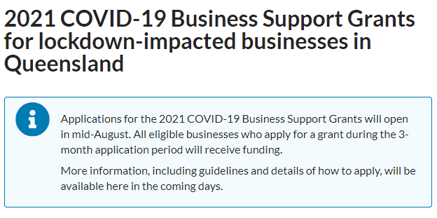 Applications for the COVID-19 Business Support Grant opens in mid-August and the Queensland Government has advised that all businesses who meet the eligibility criteria will receive the grant. Keep your eye out on the Business Queensland website for further information over the next week or so.