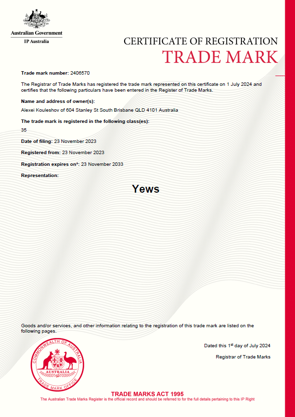 A certificate of YEWS registered trademark can viewed here. The trademark application takes seven months to be fully complete, giving all parties a reasonable amount of time to challenge applications.
